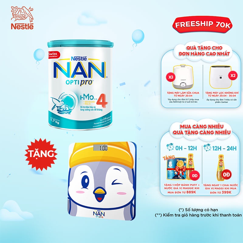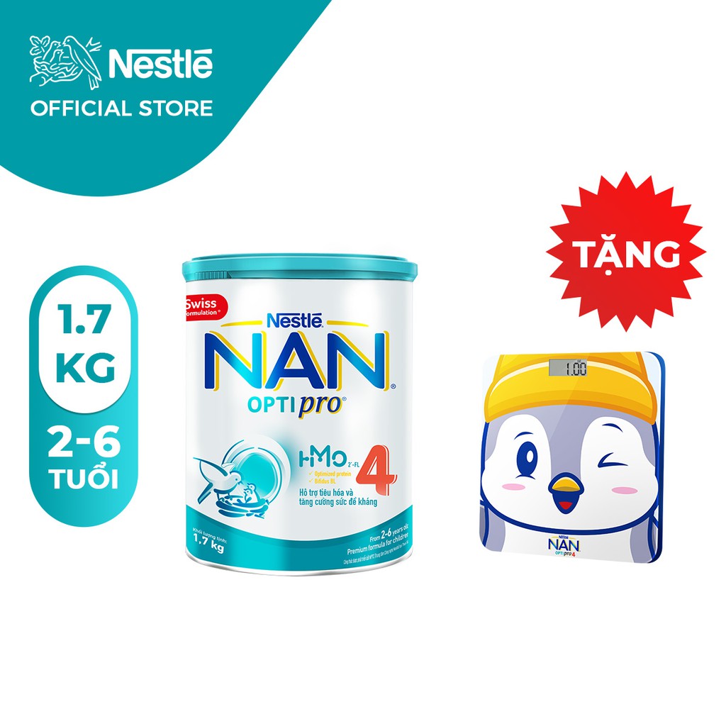 Miễn phí đổi trả nếu bán hàng kém chất lượng. Hiện tại [Mã FMCG80 giảm 10% đơn từ 400K] [Tặng 1 cân điện tử cho bé] Sữa bột Nan Optipro 4 1.7kg/lon đang được giảm giá chỉ còn 593,340đ. Số lượng có hạn hãy nhanh tay đặt khi còn hàng bạn nhé